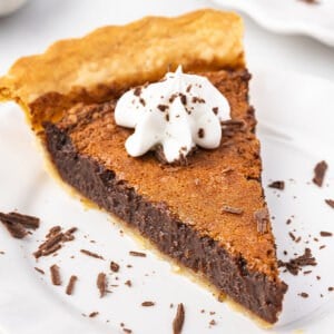 This chocolate pie is best enjoyed at room temperature, but it’s also good cold. I love to serve slices with fresh piped whipped cream and some chocolate shavings. You could even elevate it further with a drizzle of caramel sauce or a spoonful of raspberry sauce and fresh raspberries.