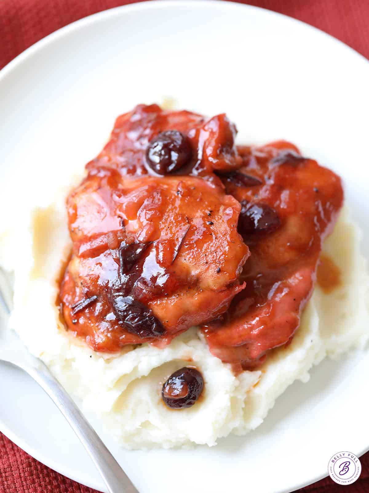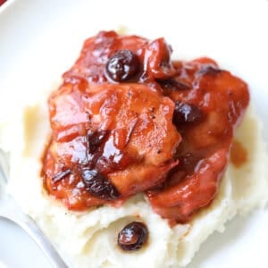 My go-to way of serving cranberry chicken is overย mashed potatoesย andย roasted green beans. You could swap the potatoes for rice or noodles if desired. Other veggies likeย roasted broccoli,ย brussels sprouts, andย asparagusย also pair well.
