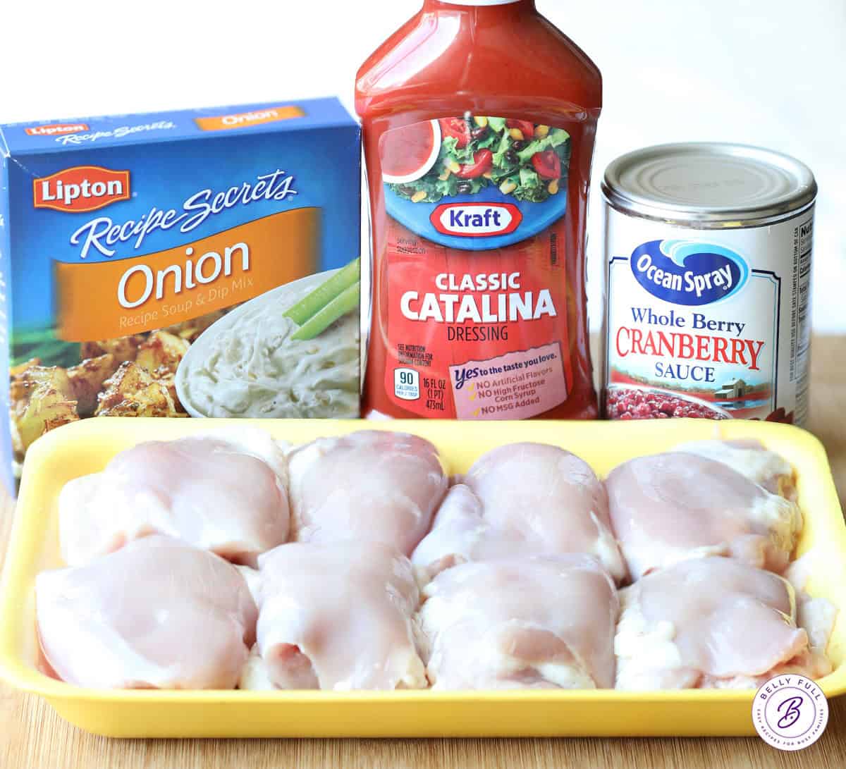 This cranberry chicken recipe goes way back to my teenage years when my mom used to make it. It’s actually one of the very first recipes I ever made all on my own – no surprise, since it’s so easy that a child could do it! Now it’s become something I serve often for my own family, since everyone loves it so much. It’s a little sweet, a little tart, rich, and so delicious! You only need 5 pantry ingredients, a mixing bowl, a casserole dish, and about $20.