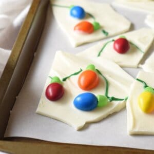 - Spread the remaining melted white chocolate onto a baking sheet in a rectangular shape. Place the M&M lights on the melted chocolate; pipe the green chocolate in a line, connecting the lights.