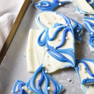 - Spread remaining melted white chocolate onto a baking sheet in a rectangular shape. Pipe both blue colored chocolates onto the white chocolate; then cut through with a knife to make a swirling pattern. Sprinkle bark with some white pearl sprinkles as snowflakes.