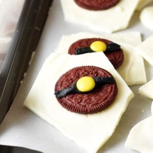 - Spread the remaining melted white chocolate onto a baking sheet in a rectangular shape. Place the Oreo cookies on the melted chocolate; pipe the black chocolate in a line across the cookie and place a yellow M&M in the center.