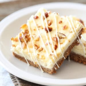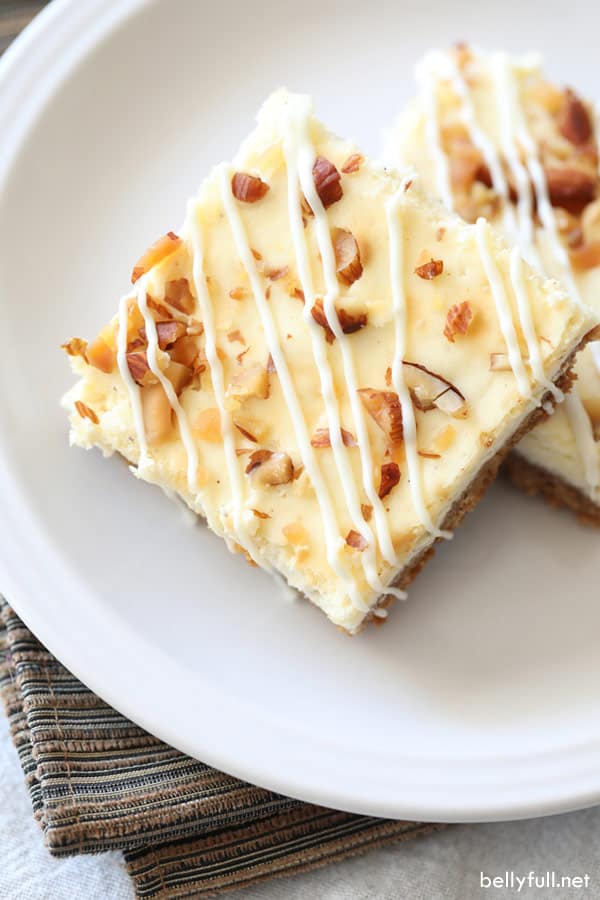 These Eggnog Cheesecake Bars are luscious cheesecake in bar form that taste like eggnog and drizzled with melted white chocolate!