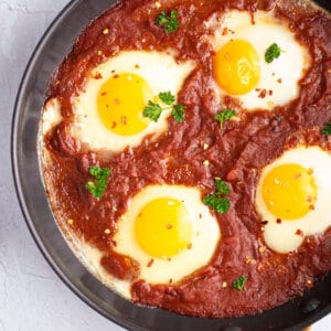 An Italian classic, Eggs in Purgatory is made with poached eggs in a hearty tomato sauce. Quick, easy, and healthy, this simple dish is perfect for breakfast, brunch, or dinner. Serve with naan or pita bread to soak up every last bit of sauce!