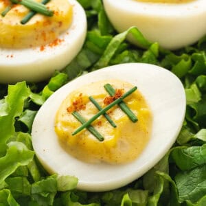 They consist of hard boiled eggs that have been cut in half with the yolks removed. The creamy filling is then combined with a few simple ingredients, usually mayonnaise, mustard, vinegar, and seasonings, and spooned back into the egg white shells. They’re a little sweet and tangy, creamy, and amazing.