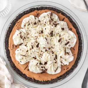 French silk pie is an indulgent and creamy dessert my family always looks forward to during the holidays. The chocolate is dark and rich, but the texture is light and fluffyโit just melts in your mouth! I whip together cream cheese and butter until smooth before adding powdered sugar, heavy cream, and chocolate. Everything sits in a blended Oreo and butter crust and is finished with homemade whipped cream and shaved chocolate. If you love our chocolate mousse pie, you’re going to adore this easy recipe!