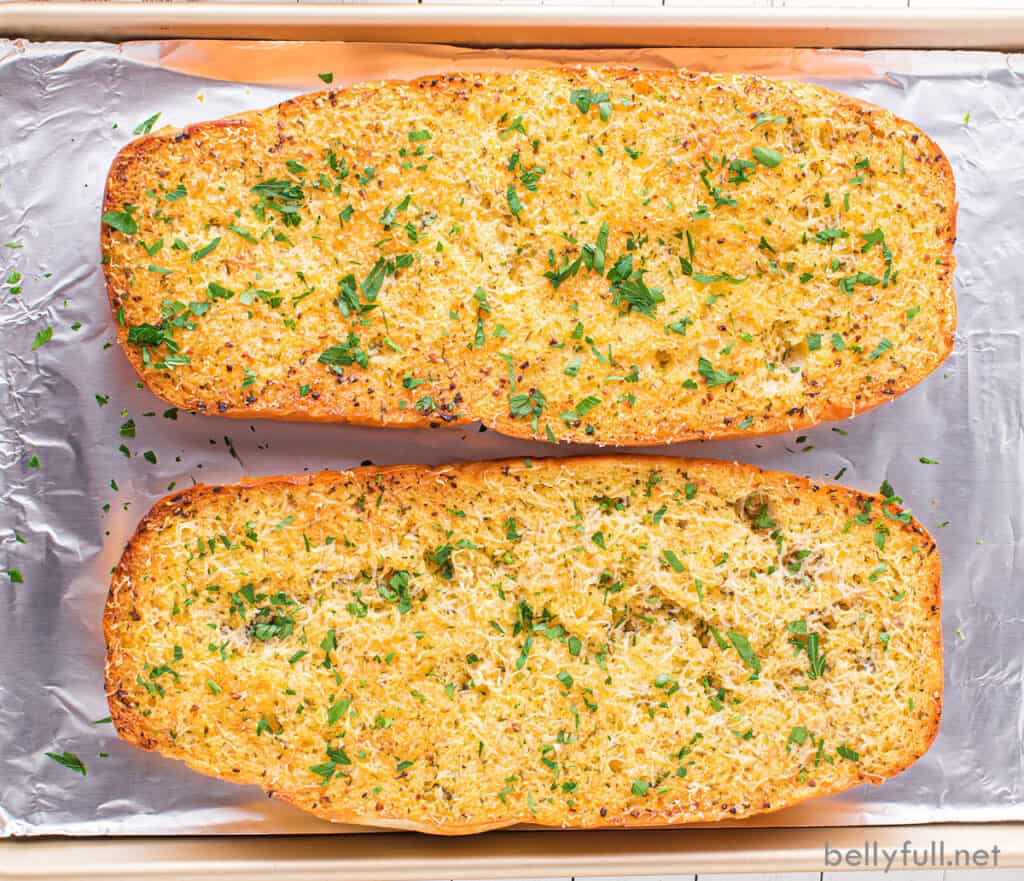 To prep and freeze the garlic bread, follow the recipe, then lay both sides of the bread on a cookie sheet (butter side up), and place in the freezer for about 45 minutes. Remove from the freezer and put the halves together, butter side in. Wrap thoroughly in plastic wrap and then in a freezer-safe resealable plastic bag, removing as much air as possible. Freeze for up to 2 months. Thaw it in the refrigerator the night before and bake per recipe instructions. If baking from frozen, bake at 350°F for 20 minutes or so, until warmed through.