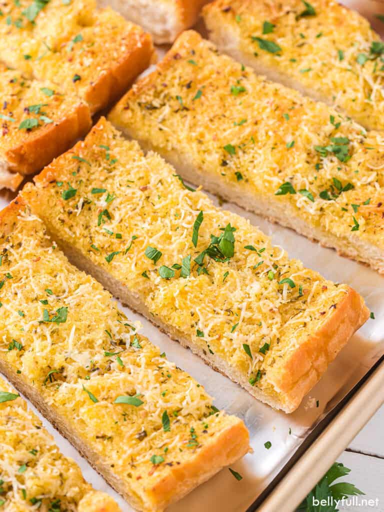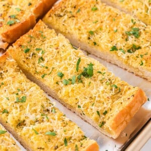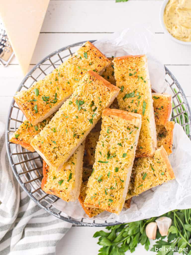 There’s certainly nothing wrong with garlic powder, dried herbs, and Parmesan that comes in a container. I’m all for shortcuts. But not with homemade garlic bread. When I want the absolute best flavor, I go with fresh. This recipe is still so easy to make, since prepping the ingredients only takes 5 minutes. I find the result is so worth it.