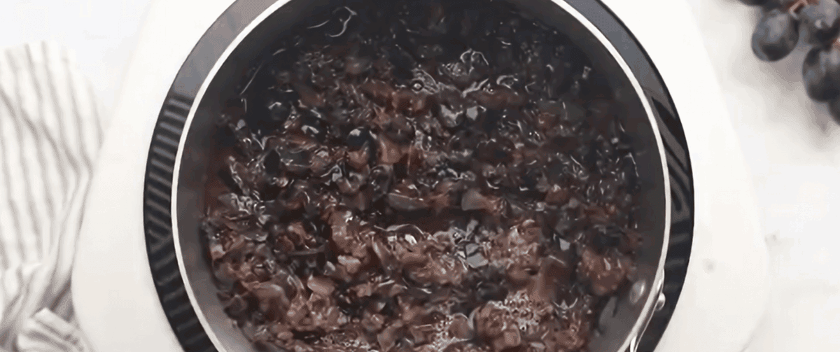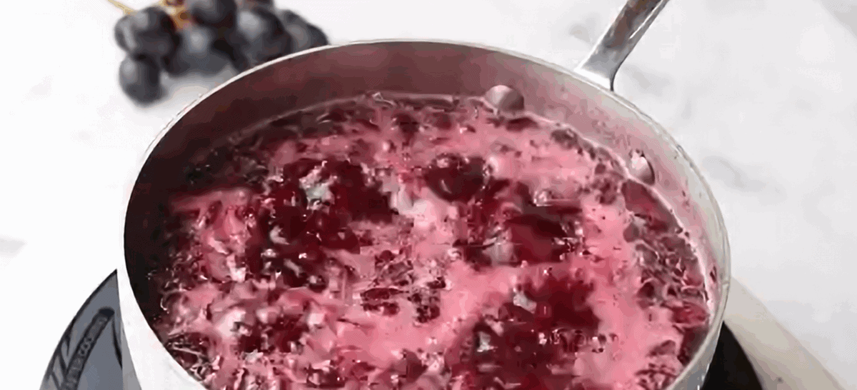 - In a large, heavy-bottomed saucepan, add the crushed grapes, and bring to a boil over medium-high heat, then reduce the heat to medium and simmer for about 10-15 minutes, stirring constantly to prevent sticking and burning.