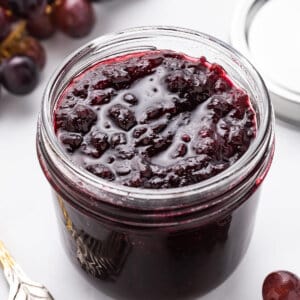This homemade Grape Jam recipe is made with just 4 simple ingredients and can be enjoyed right away or once fully processed. I like to eat it on a peanut butter and jelly sandwich, with crepes or biscuits, swirled into yogurt, and so much more. It also makes a great gift!