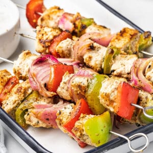 I like to thread in some red onion and bell peppers for extra color and taste, and I always serve them with a generous scoop of tzatziki sauce. Itโs quick, easy, and feels like a little taste of the Mediterranean right in my backyard.