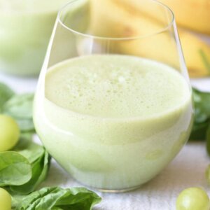 As with most smoothies, you place all the ingredients in a blender, put the lid on, and blend until smooth and your desired consistency is reached. We recommend putting the liquids in first and the ice last (or in this case, the frozen grapes and frozen bananas, which take the place of ice.) Pour into tall glasses and enjoy. This green smoothie does have a looser consistency, so if you want it thicker, add in a cup of ice cubes and blend until smooth.