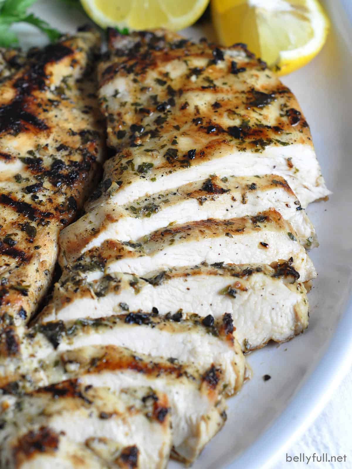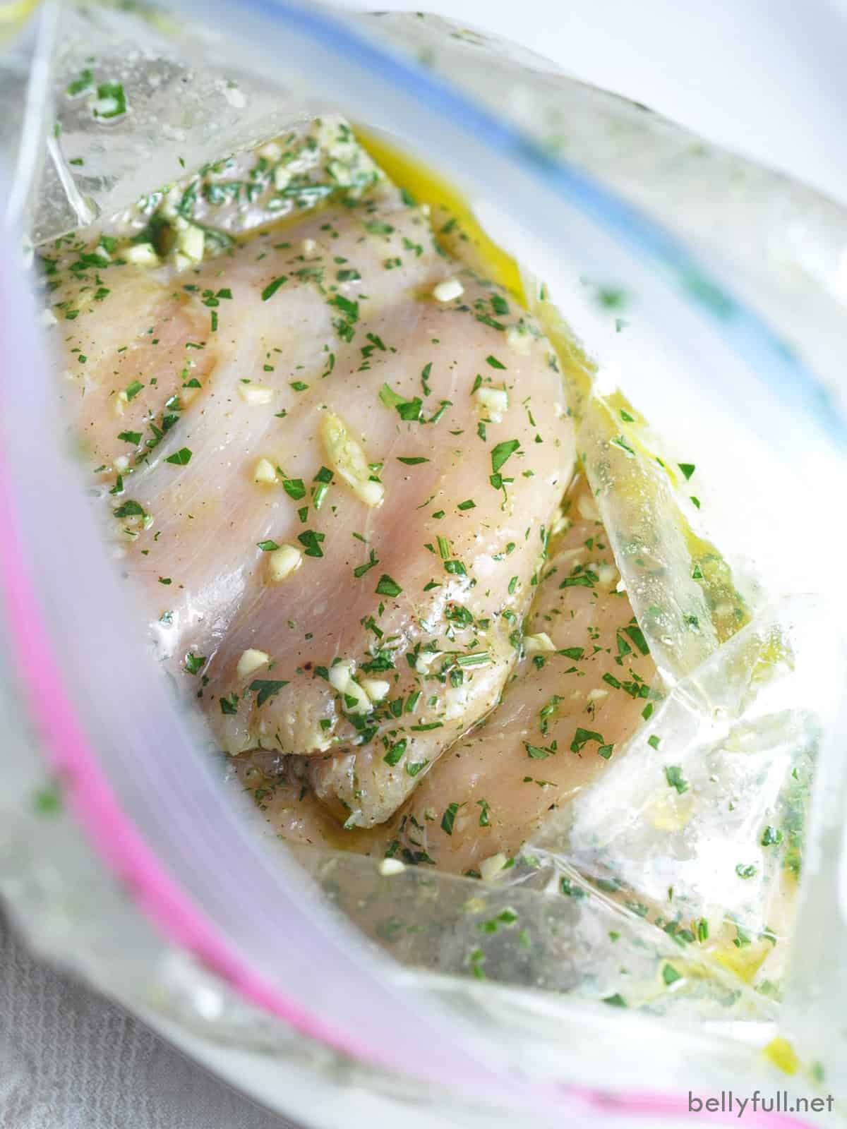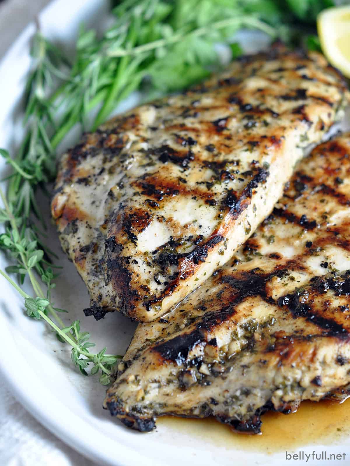 I think everyone should have a good basic steak marinade and chicken marinade for grilled chicken breasts in their arsenal. This one is mine. The marinade is made up of garlic, herbs, and lemon. It’s so incredibly simple, but so bright and flavorful. Itโs honestly all you need to season most food, really! The key is using the freshest ingredients and allowing the chicken to marinade a good amount of time, which renders tender and moist results.