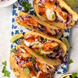 Fish tacos are best served immediately after they’re assembled. You can however cook the fish the day before and make the slaw up to 2 days ahead of time. Keep both stored in an airtight container in the fridge. Gently reheat the fish in the microwave drizzling the fish with a bit of olive oil or lime juice to prevent it from drying out too much.