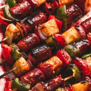 These Grilled Hot Dog Kabobs turn basic hot dogs into a fun entree that’s loved by kids and adults alike. Onions, red and green bell peppers, and pineapple are skewered with hot dog pieces, then coated in a savory BBQ sauce. I love these for BBQs and picnics. It’s an upgrade on basic burgers and hot dogs, but still wildly easy and quick to make!