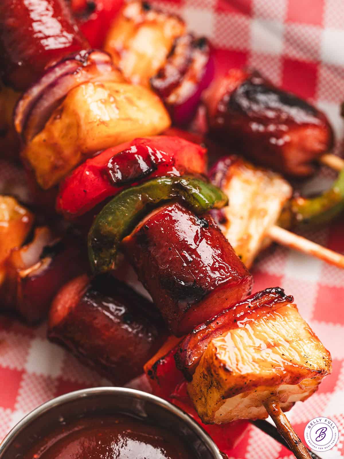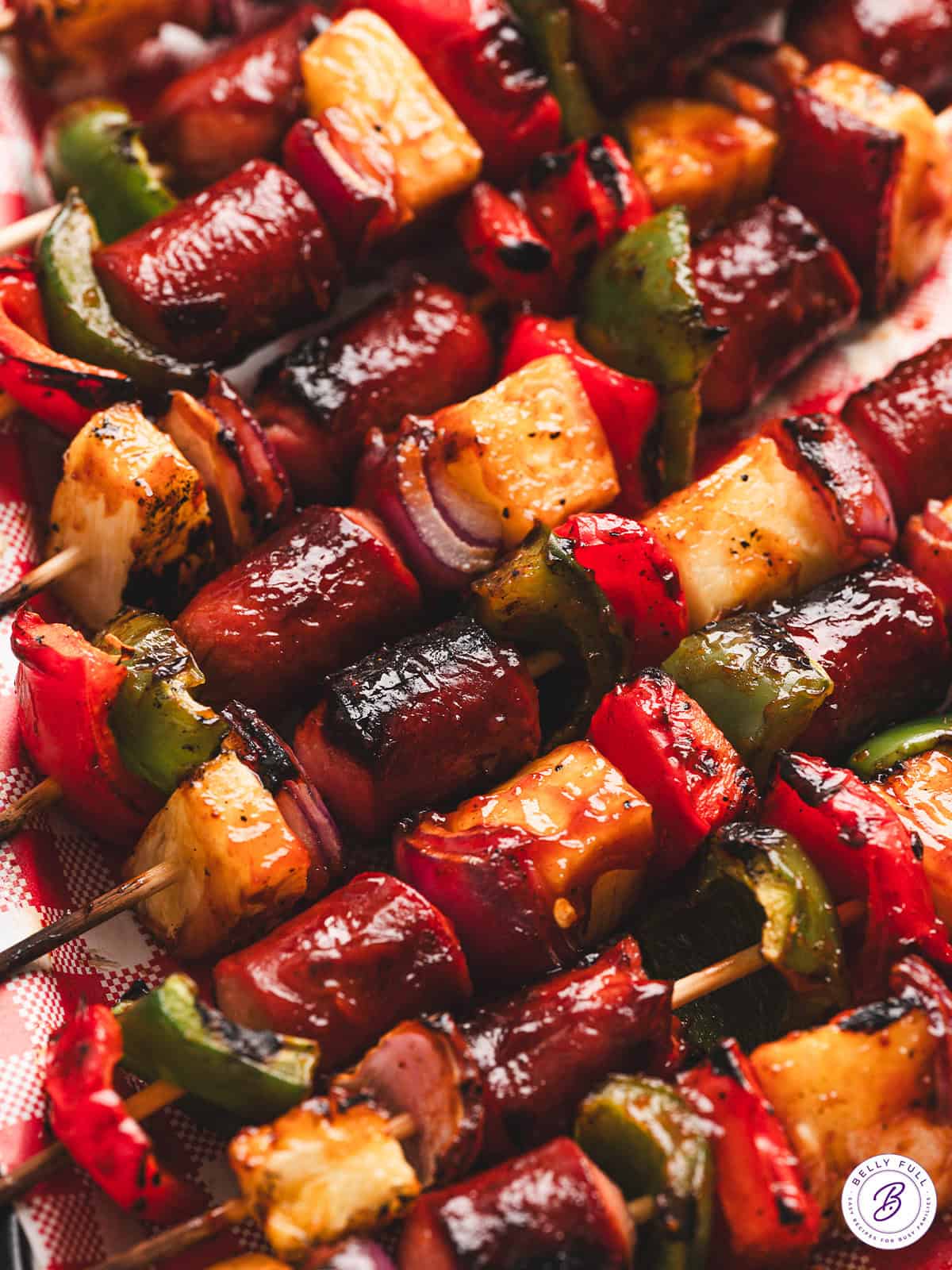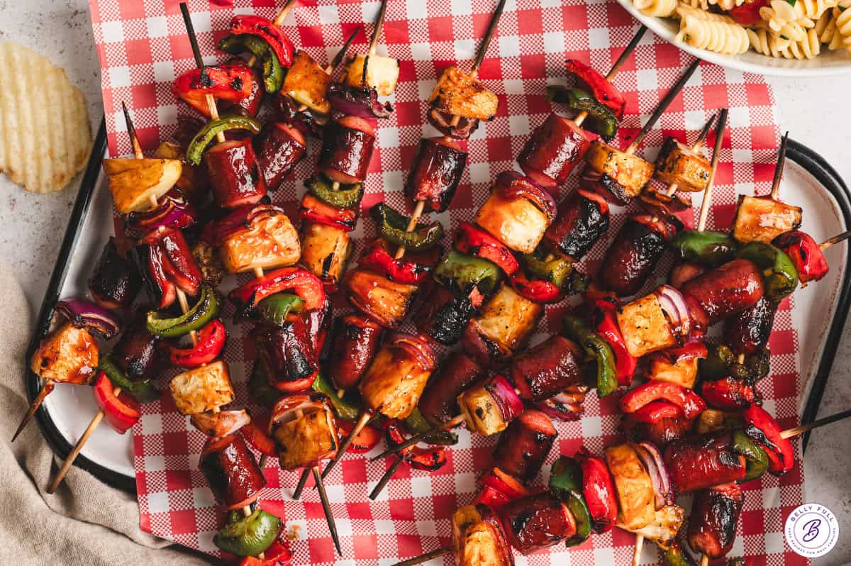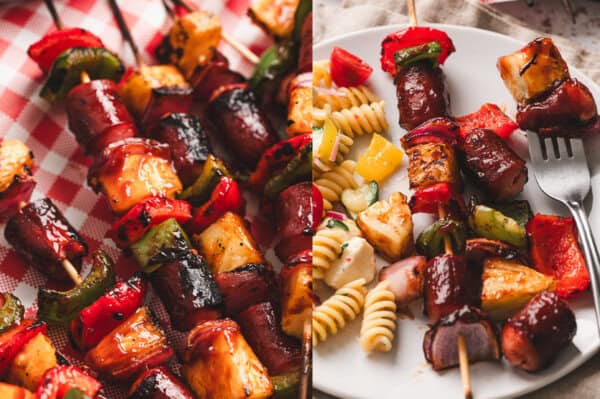 These kabobs are perfect for a casual summer BBQ. I love to serve them with my favorite picnic sides, like coleslaw, macaroni salad, and baked beans. Waldorf salad and spaghetti salad would also be great options. And don’t forget dessert! I love these banana split dessert kabobs to keep with the theme!