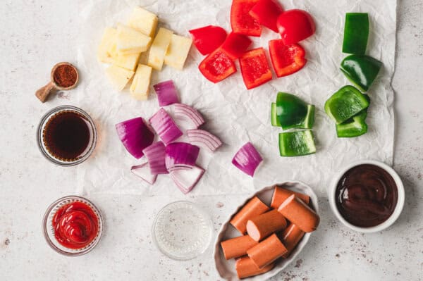 - Slice hot dogs into quarters and cut red onion, green bell pepper, red bell pepper, and pineapple into 1-inch pieces.