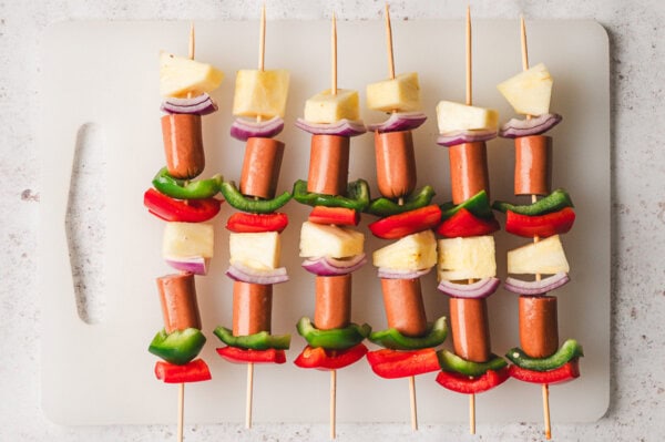 - Thread the skewers by alternating in this order: red pepper, green pepper, hot dog, onion, pineapple. Repeat this pattern until the skewer is full. Build the other skewers the same way.