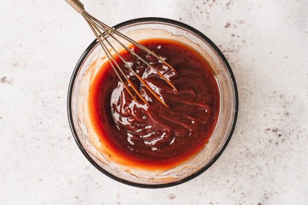 - In a mixing bowl, whisk together BBQ sauce, ketchup, soy sauce, rice vinegar, and chili powder until thoroughly combined.