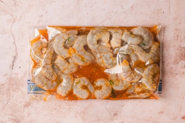 - Remove shrimp from the plastic bag and transfer the marinade to a little saucepan.