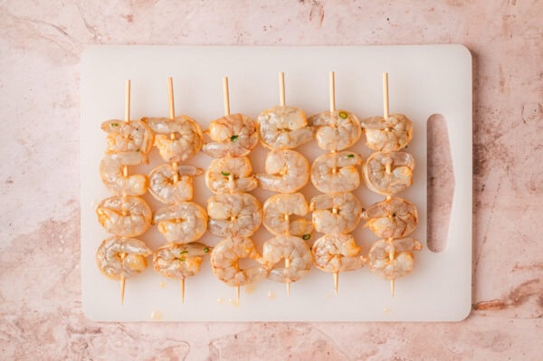- Thread 4 to 5 shrimp onto metal skewers, leaving a bit of space in between. (If you only have wood or bamboo skewers, soak them first for at least 30 minutes.)