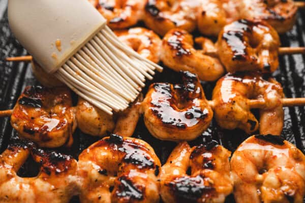 - Oil the hot grill grates well and place skewers on them, close the lid, cook for 2-3 minutes. Flip the shrimp and baste with some of the reserved marinade, cook for another 2-3 minutes until the shrimp are opaque and cooked through.