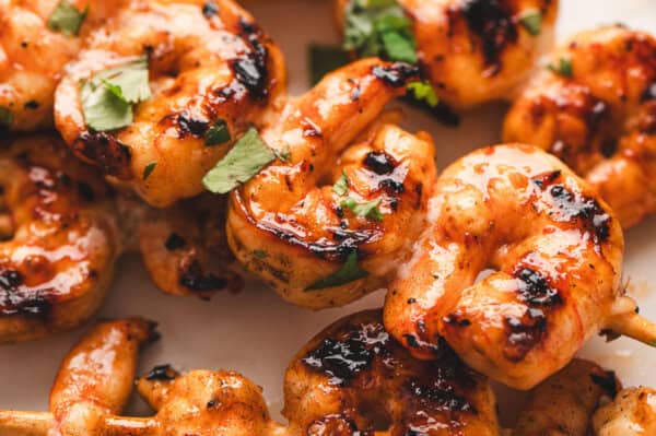 Grilled shrimp works as both a tasty appetizer and a main meal. Use any reserved marinade as a dipping sauce or when serving this as a main dish, it pairs well with pineapple coconut rice, pineapple cucumber salad, caprese corn salad, and honey-lime fruit salad.