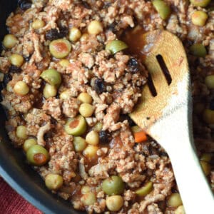 This easy Cuban Picadillo recipe uses ground turkey simmered in tomato sauce, olives, beans, raisins, and spices. A healthy dinner option, it’s the perfect mixture served over rice, on rolls, or as taco filling!