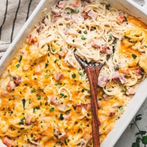 Ham tetrazzini is a classic baked pasta casserole made with tender spaghetti, diced ham, and a rich, creamy sauce thatโs finished with melted cheese. Itโs the kind of comforting, old-school dinner thatโs perfect for using up leftover ham, feeding a hungry family, or making ahead for a busy weeknight. This version keeps things simple with pantry staples for a throw-together effortless meal.