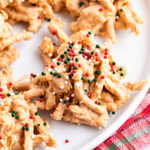 These Haystack Cookies are a sweet and salty treat made with vanilla chocolate, butterscotch chips, macadamia nuts, and chow mein noodles. They’re a classic no bake dessert great anytime of year, but especially perfect at holiday time when you need your oven the most. Change up the sprinkles to suit the occasion. They’re so easy and delicious!
