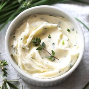 In this easy herb butter recipe, we turn regular butter into creamy and fluffy garlic and herb flavored butter. It’s savory, aromatic, and just fantastic used on roasted vegetables, meat, and poultry.