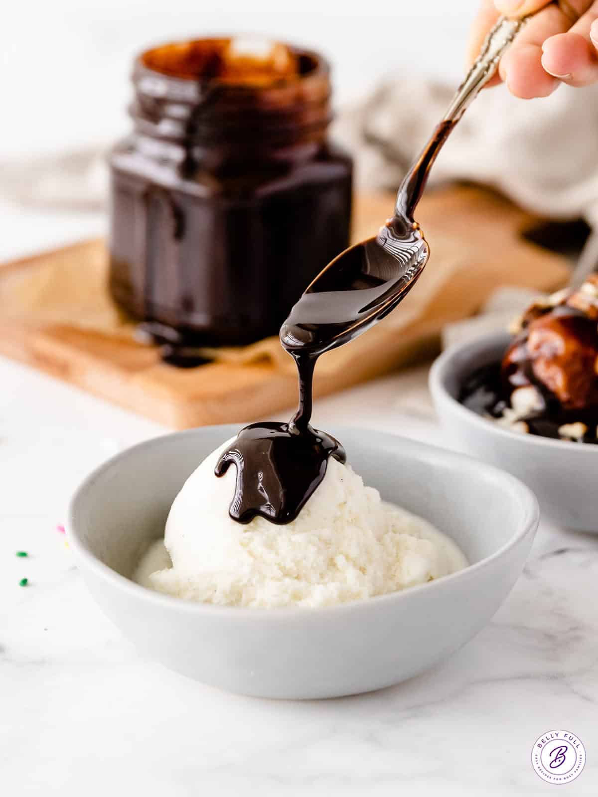The difference between chocolate sauce and hot fudge sauce is that hot fudge usually uses cream and butter, making it thicker than chocolate sauce, which uses sugar and water. So, technically this is chocolate sauce, but it definitely thickens up as it cools, so it’s like in-between. Basically, perfect.