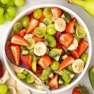 This fruit salad is extremely versatile using whatever is ripe and in season and depending on your personal tastes, just take note that some fruit is more finicky (like raspberries – we avoid those since they break down so easily.)