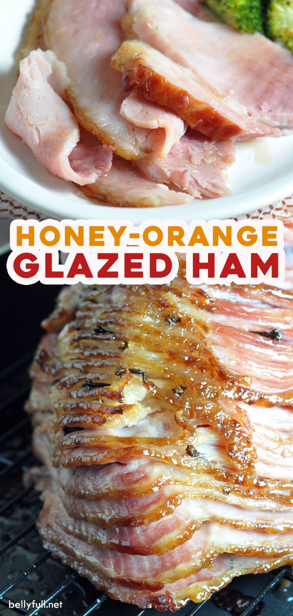 - In a small bowl, whisk together the honey, brown sugar, orange juice, and garlic powder; Drizzle 1/3 of the glaze over the ham, spreading evenly. Cover with foil.