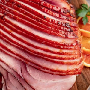 This Honey Glazed Spiral Ham recipe delivers the most incredible flavored ham. Studded with whole cloves then coated in a simple glaze made up of honey, brown sugar, orange juice, and garlic powder.ย So perfect for Easter, Christmas, or any occasion!