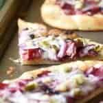 This Hot Pastrami Flatbread can be enjoyed for lunch, a light dinner, or cut up into smaller portions and serve as an appetizer. Pastrami, dill pickles, and Swiss cheese lay on top of flatbread smeared with Caesar dressing and baked until melty and golden. It’s so easy to make and such a circus of flavors!