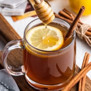 If you’ve never had a hot toddy before, this classic hot toddy recipe is a great introduction. Hot toddies are an easy, warm cocktail made with tea, dark liquor (such as whiskey or brandy), lemon, and honey.