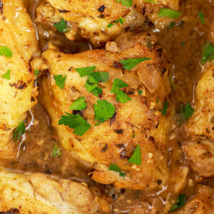I like to use bone-in chicken thighs with the skin for this recipe as I find them to be the most flavorful and I love how the skin crisps up when I sear it. However, this recipe will work with whatever variety of chicken thighs you want to use – bone-in, boneless, skin or no skin.