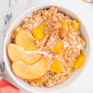 I serve my peaches and cream oatmeal topped with some fresh peaches when in season. You can add a sprinkle of cinnamon and/or brown sugar if desired as well, for some extra flavor. If you like your oatmeal with extra liquid, add a splash of milk or more cream when serving.