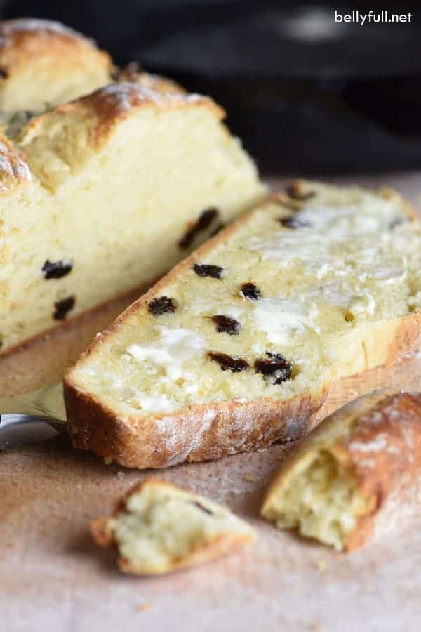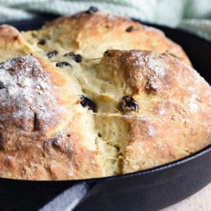 I love this! I have never ever made or eater Irish sode bread before and I am almost 50! I dont have a cast iron skillet so I used me le Creuset dutch oven uncovered and it worked perfectly! I love how the raisins taste in it. It gives it a great sweetness. It is a heave dense bread. I love the yellow hue it has compared to other irish soda breads that look unappitizing. I used kerrygold irish butter in it and on it to! Thank you so much for this recipe. I will definatly be making this again. maybe even for Easter!