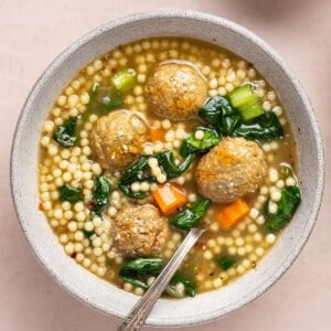 Italian Wedding Soup is a brothy soup made with a combination of chicken and beef broth, meatballs, small pasta, and spinach or other greens. Contrary to the name, it is not served at Italian weddings. Instead, the name comes from the Italian phrase “minestra maritata” which translates to “wedded soup”. It’s said to be a reference to how well the different flavors come together, like a marriage.