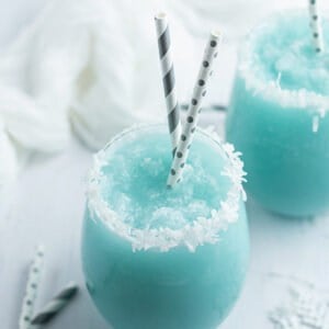 This Jack Frost Winter Cocktail recipe is so festive, pretty, and delicious! It tastes like a piña colada, but blue curacao and sweet shredded coconut give it that fun wintery look. A perfect holiday drink that takes only minutes to whip up!