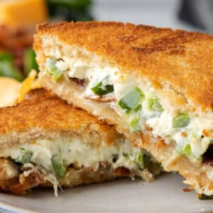 All your favorite jalapeno popper ingredients sandwiched between slices of thick bread and toasted to crispy perfection! This Jalapeno Popper Air Fryer Grilled Cheese is ready in 8 minutes and may become your new lunchtime favorite.