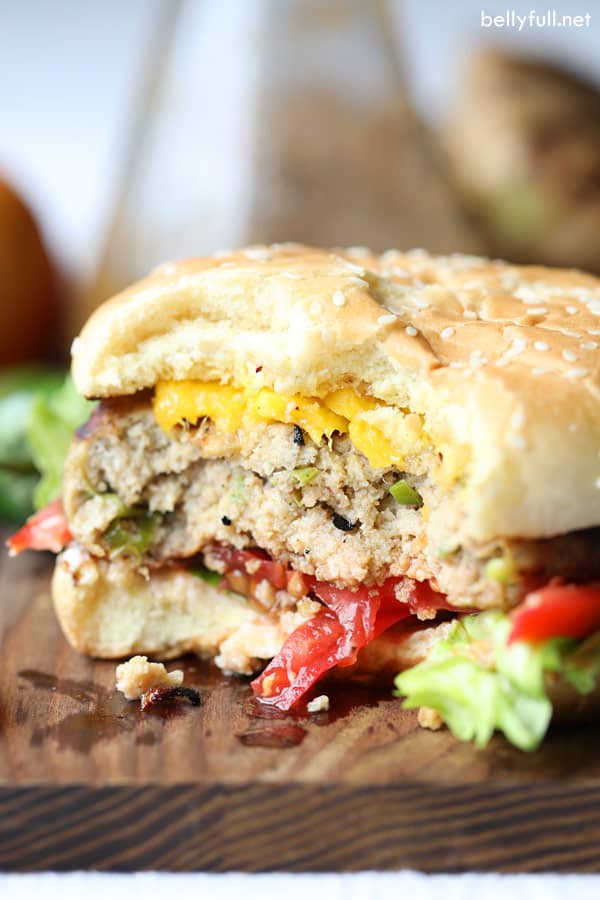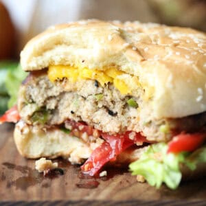 I have two favorite turkey burgers that I make frequently – my Feta Turkey Burgers and these Jerk Turkey Burgers, which are made with my jerk marinade and topped with fresh mango slices. They burst with flavor.