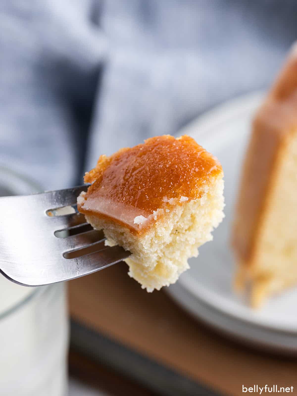 - Add the glaze to the cake. Use the thin end of a chopstick to poke holes in the cake while it’s still warm. Slowly pour the glaze all over, making sure it gets in the holes. Wait for it to absorb before pouring and poke more holes if needed.