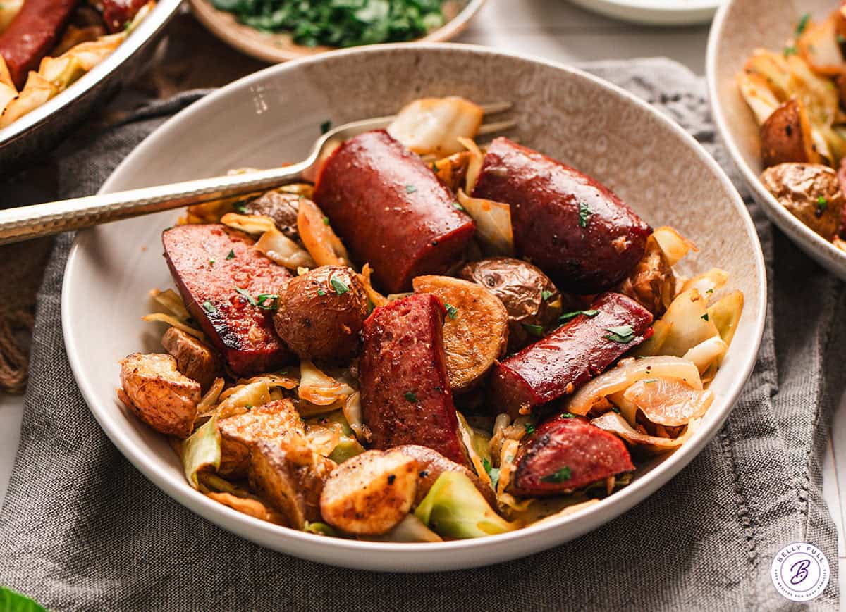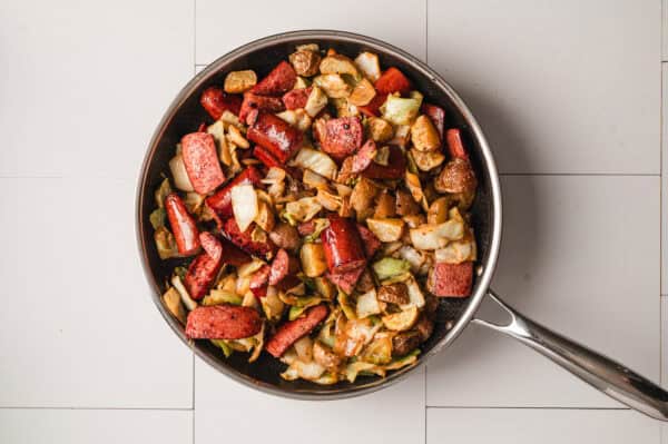 - Omit the potatoes or swap egg noodles. You could replace the roasted potatoes with cooked egg noodles like Haluski, if preferred. Or if you’re following a low carb diet, simply leave the potatoes (or noodles) out.