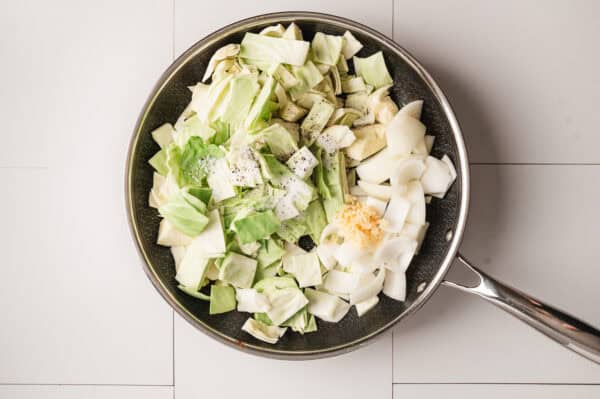 - In the same pan with some of the rendered kielbasa fat, add a small head of chopped cabbage, 1 large cut sweet onion, 3 cloves minced garlic, 1 teaspoon sugar, and 1/2 teaspoon EACH coarse salt and pepper.
