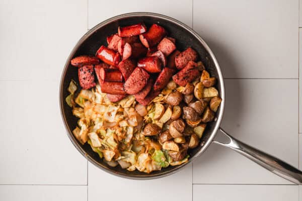 - Make the kielbasa and cabbage:Warm a tablespoon olive oil in a large nonstick skillet over medium-high heat and add 14 ounces kielbasa cut into 1 & 1/2-inch pieces. Cook, without stirring for 1 minute. Then stir occasionally for about 3 minutes. Transfer to a plate with a slotted spoon.