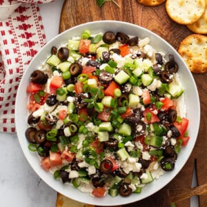 Who can ever resist a 7 layer dip! This one has a Greek flair starting with cream cheese, hummus, and Greek seasoning as the base, piled with fresh vegetables and a sprinkling of feta cheese. It’s vegetarian, gluten free, and fairly healthy too, so you can accommodate many different people with dietary restrictions. No cooking required and it comes together in minutes!