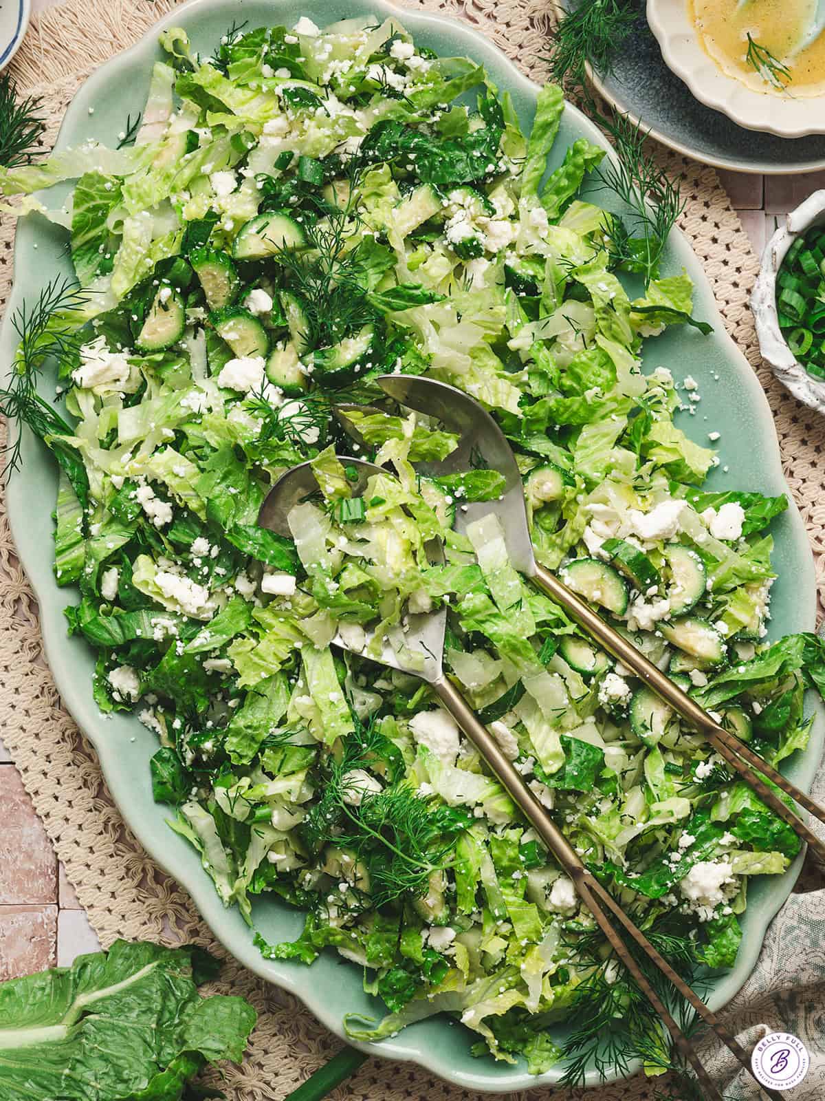 - Place lettuce in a large bowl along with the sliced cucumbers, scallions, dill, and feta cheese.